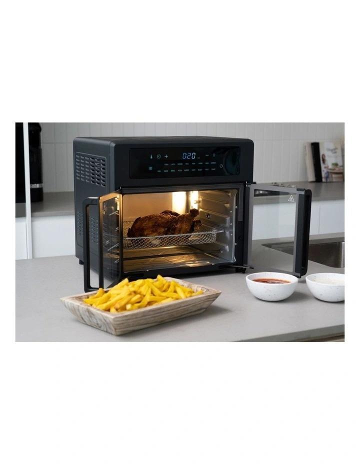 25 litre capacity and wait as the air fryer convection oven circulates superheated air up to 200C. Watch as your food air frys, defrosts, bakes, broils, roasts, proofs or toasts its way to perfection behind the secure, glass viewing window coupled with an oven light button option.